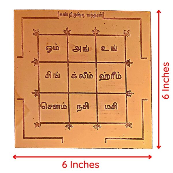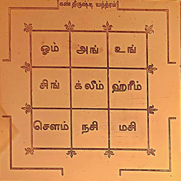 கண் திருஷ்டி யந்திரம் – 6 x 6 இன்ச் செம்புத் தகட்டில் உள்ள அதிசக்திவாய்ந்த மந்திரங்கள் பதித்த இந்த யந்திரத்தை நம் வீட்டில், அலுவலகத்தில் வைத்து வழிபடுவதன் மூலம் எந்த விதமான