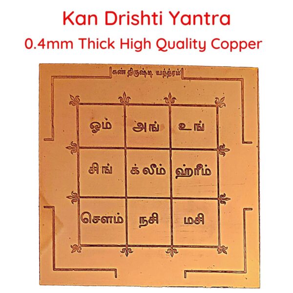 Kan Drishti Yantra is made of high quality 6 X 6 Inch thick Copper Plate (Copper Plate Thickness 0.4mm (27 Guage)). Kan Drishti Yantra is an auspicious, powerfulsacred geometric pattern inscribed with mantra letters. Kan Drishti Yantra wards of evil eye and protect one’s home and family from the effets of unknown negativity, it brings peace of mind, health, permanent income and power. Kan Drishti Yantra can be placed and worshiped in the home, office, or in factory. Kan Thirusti Yantra can be photo framed/directly hung in main hall/main entrance of the premises.